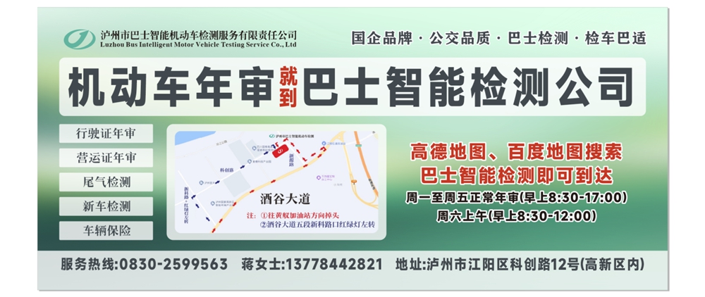 瀘州市巴士智能機動車檢測服務有限責任公司占地面積地20余畝,是瀘州市公交集團全資子公司,位于瀘州市江陽區(qū)科創(chuàng)路12號(高新區(qū)內)。檢測場站服務項目齊全、設備先進、管理規(guī)范、實力雄厚,檢測人員優(yōu)秀,技術力量精湛。本公司堅持“公正公平、科學準確、以人為本、高效服務”的宗旨,一切為客戶著想,全面為客戶提供規(guī)范檢測、誠信服務,為受檢車輛提供可靠的檢測數(shù)據(jù),為瀘州市機動車安全運行提供支撐和保障。
